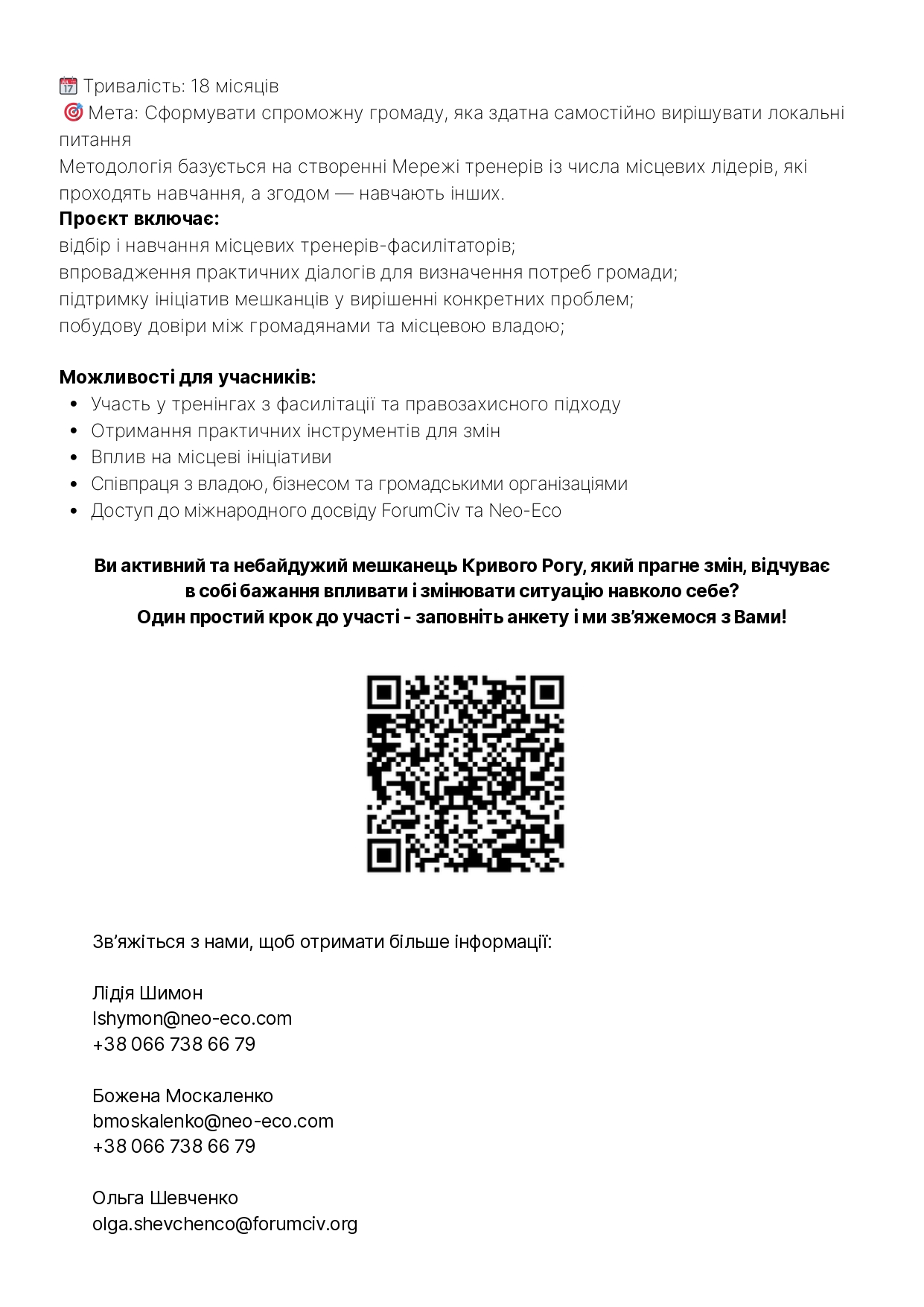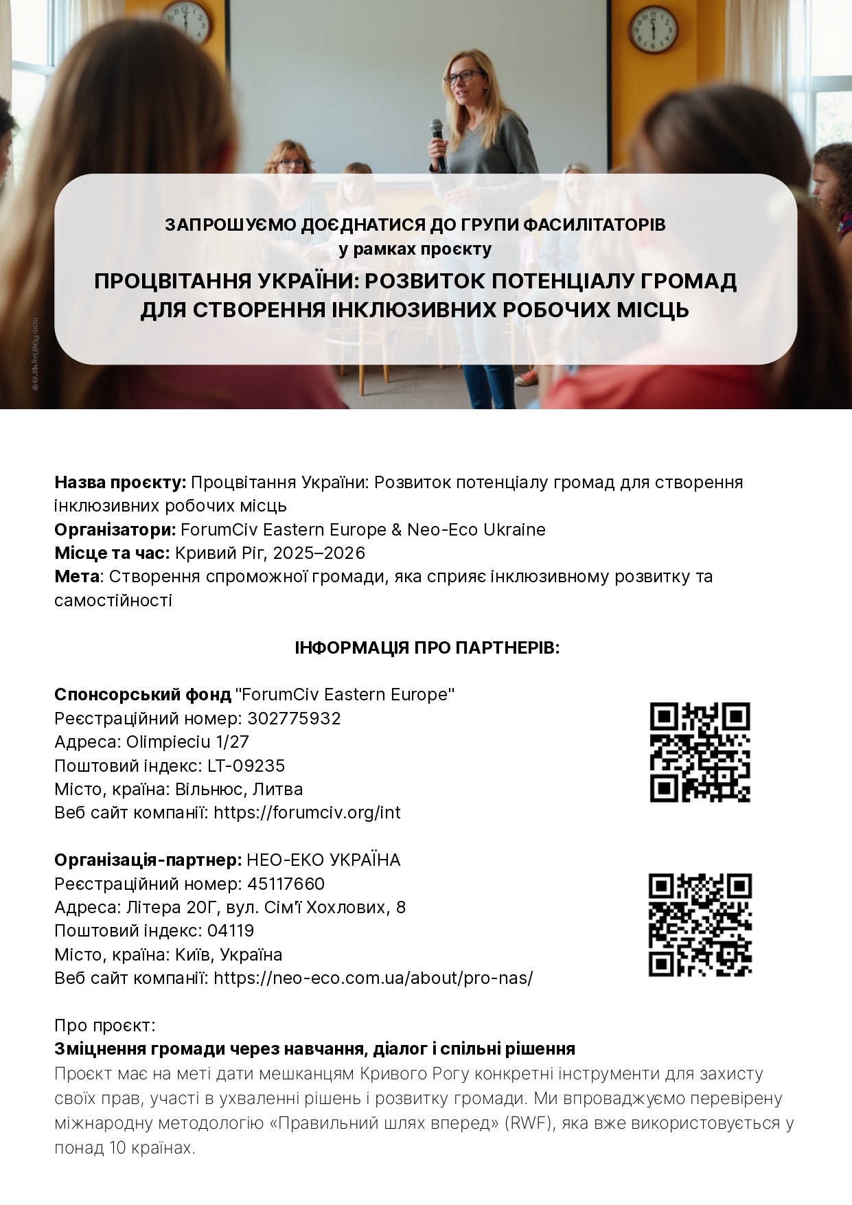 Зміцнення громади через навчання, діалог і спільні рішення Проєкт має на меті дати мешканцям Кривого Рогу конкретні інструменти для захисту своїх прав, участі в ухваленні рішень і розвитку громади. Ми впроваджуємо перевірену міжнародну методологію «Правильний шлях вперед» (RWF), яка вже використовується у понад 10 країнах.