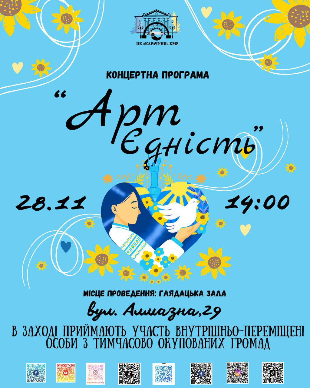 ПК «Карачуни» КМР запрошує творчих людей, дітей, родин з числа ВПО прийняти участь в концертній програмі «Арт єдність».